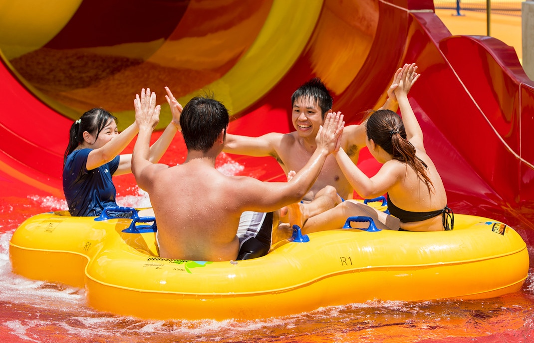 Line up side by side on Kraken Racers, Singapore’s first four-lane mat racer slide. Launch from the top, pick up speed on every dip, and splash down together, bragging rights go to the fastest rider at the finish.